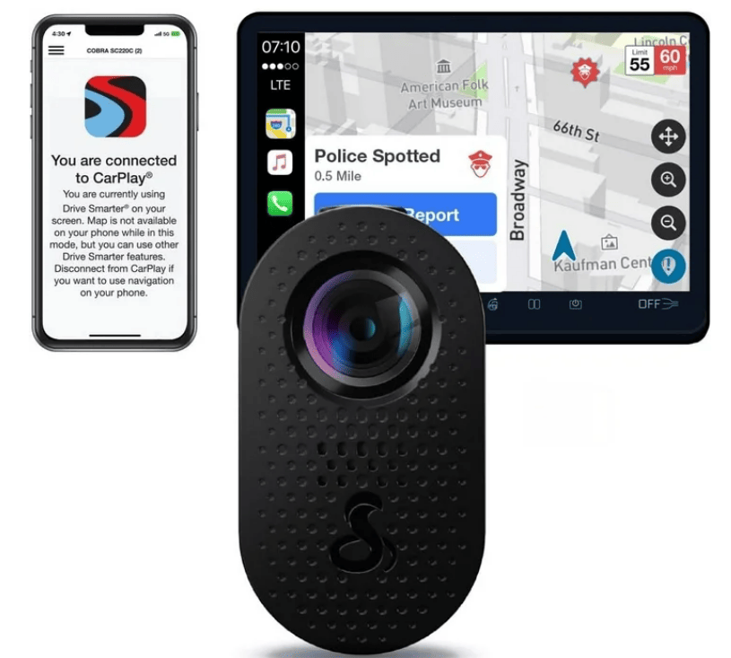 The SC110 is more than just a camera—it’s your road companion. With built-in WiFi, you can view, save, and share footage straight from your phone. Integration with Apple CarPlay and Android Auto makes navigation and control easier than ever. Get live police alerts, red-light camera notifications, and other real-time updates from the Cobra driving network to help you stay informed and ahead of hazards.