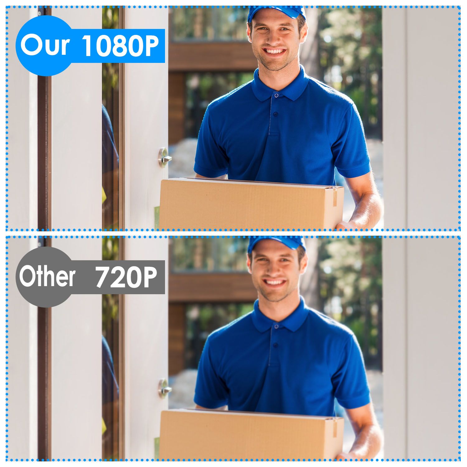 *1080P Full HD & Night Vision*:The 1080P camera is equipped with 6 pcs infrared light,which is able to provide HD videos with a great amount of details regardless of ambient light and weather conditions. With a field of vision of 155 degrees,it can capture more of what's going in front of the door. It can serve as important evidence when a thief breaks into your house.