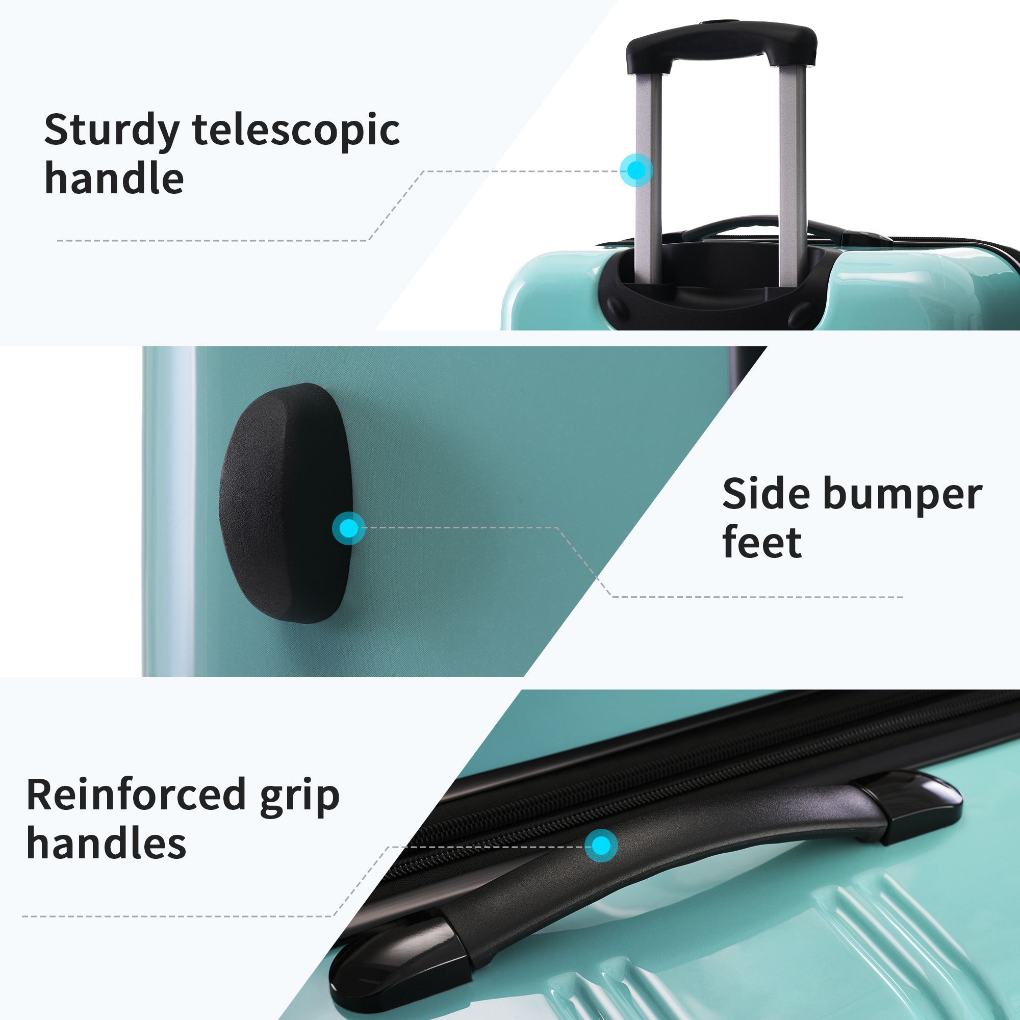 Material: These luggage sets with wheels are made from high tenacity PC material, harder and more resistant to pressure, effectively reducing damage caused by collisions during travel.