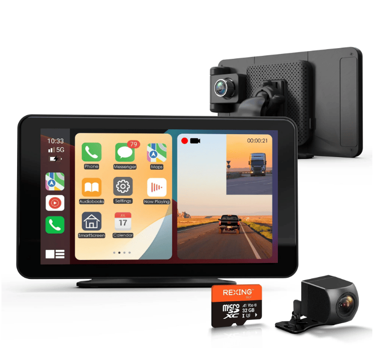 The REXING 7" Wireless CarPlay/Android Auto Receiver is a feature-packed upgrade for any vehicle, blending modern infotainment and high-resolution dash cam capabilities in one convenient device. Its 7″ IPS touchscreen offers crisp visuals and easy control of wireless Apple CarPlay and Android Auto, letting you navigate, play music, take calls, and use voice assistants effortlessly. The integrated 4K front camera and 1080p rear camera provide full driving surveillance, while GPS functionality ensures accurate location tracking and route history. With Bluetooth, built-in microphone, speaker, and a free 32GB card, this smart system delivers modern connectivity, safety, and value.